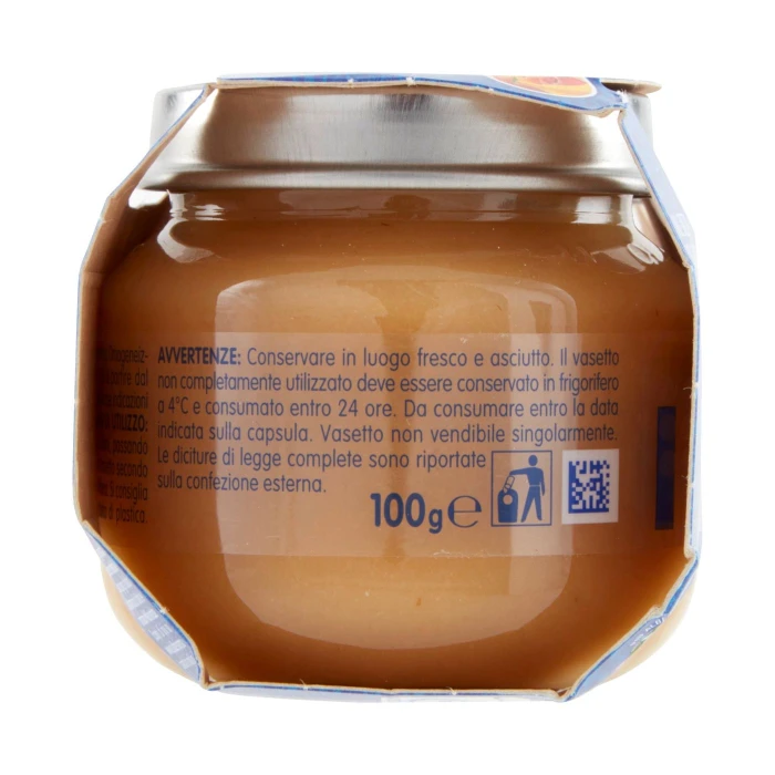 Purea di frutta mista (mela, banana, pesca e albicocca) (91%), Acqua, Farina di riso, Vitamina C, Senza glutine