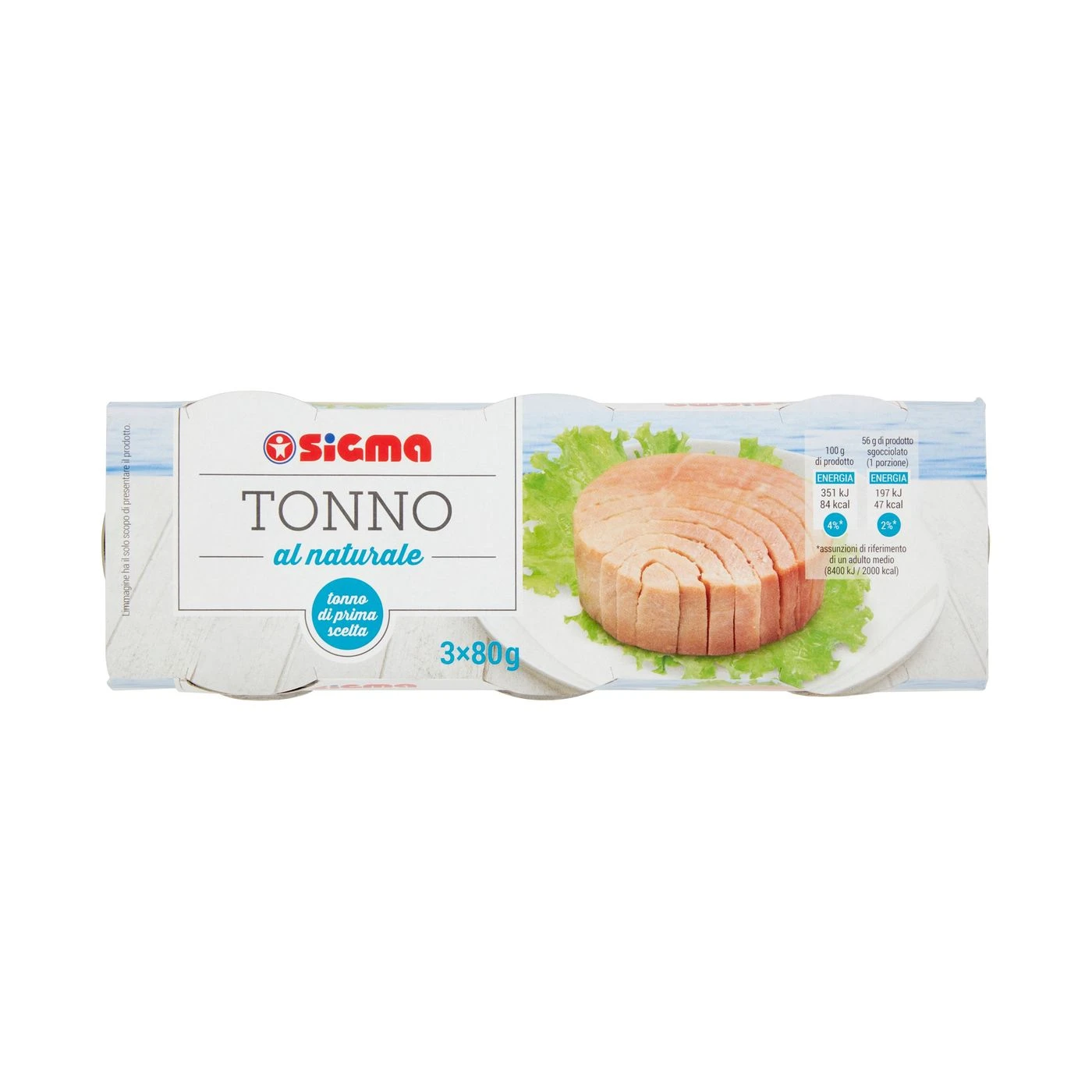 Per 100 g di prodotto - Energia: 351 kJ / 84 kcal, Grassi / di cui acidi grassi saturi: 0,6 g / 0,1 g, Carboidrati / di cui zuccheri: 0 g / 0 g, Proteine: 20 g, Sale: 1,5 g, La confezione contiene 3 porzioni da 56g di prodotto sgocciolato